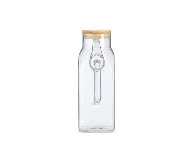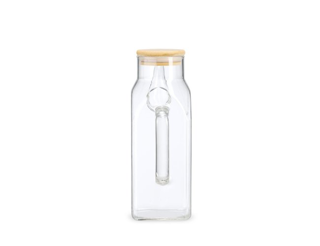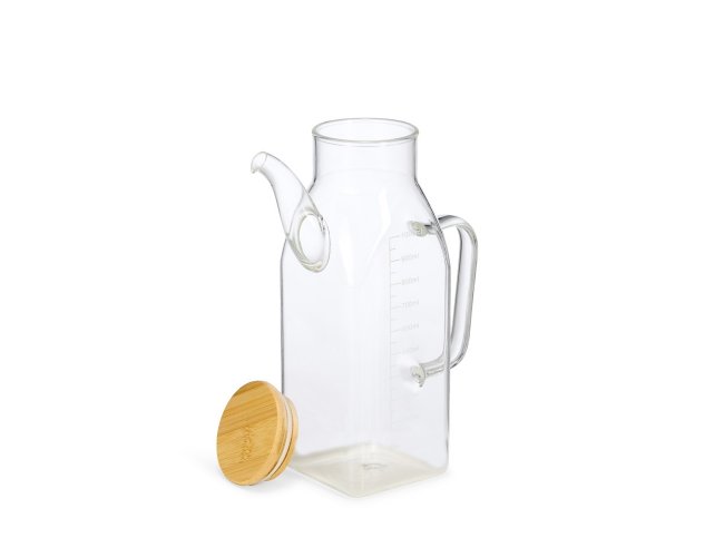 Jarra de vidro borossilicato, material resistente à oscilações de temperatura. Com capacidade para até 1 litro, possui marcação de capacidade no corpo do recipiente e tampa de bambu com anel de vedação. Acompanha tampa protetora para o bico em silicone.