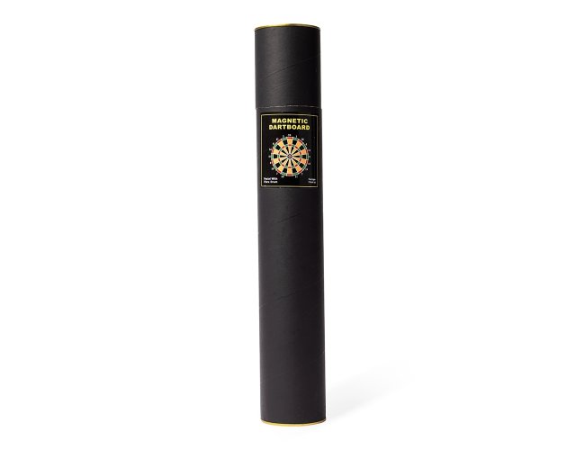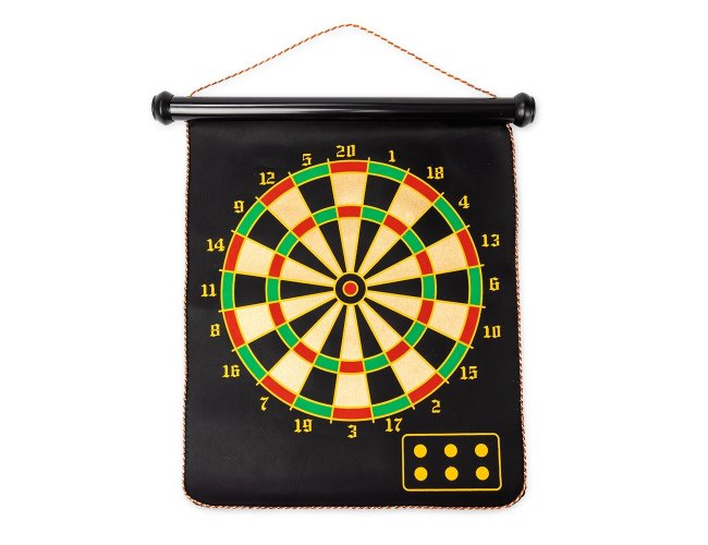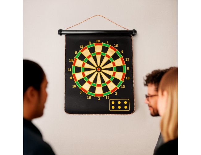 Jogo de dardos composto por um alvo dobrável com dupla face em veludo e detalhes em plástico e nylon, além de seis dardos de pontas magnéticas e cabos em plástico. Acompanha tubo em papelão e metal para guardar os itens do conjunto.