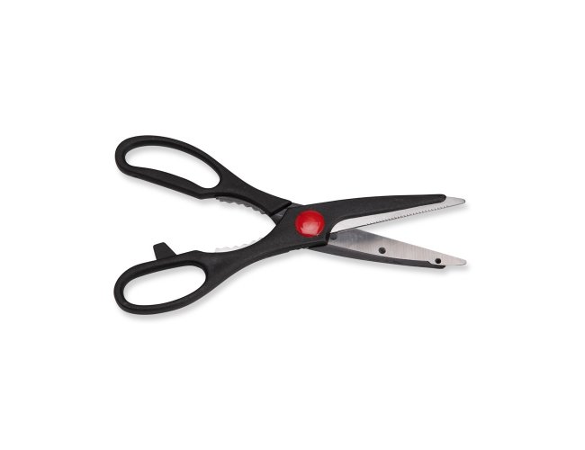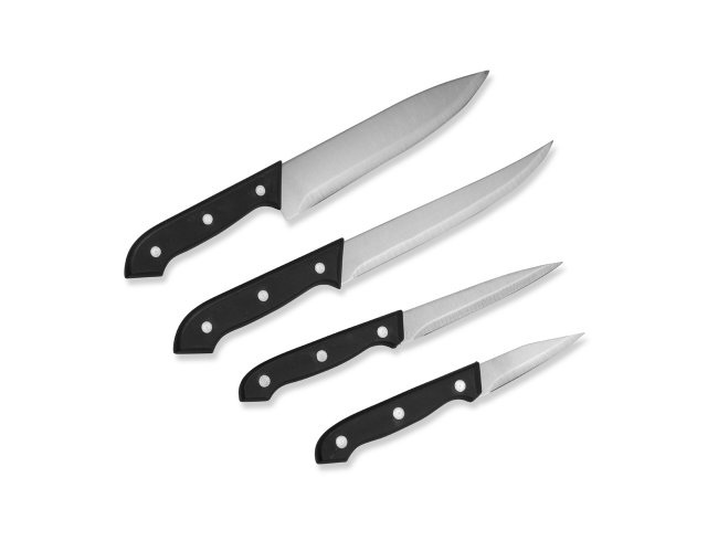 Kit churrasco formato por seis itens. O conjunto apresenta uma tábua em madeira de pinho, uma tesoura multiuso com estrutura em polipropileno e lâminas em inox e quatro facas com cabo em PP e lâminas em inox em diferentes tamanhos: 3, 4, 6 e 8 polegadas.