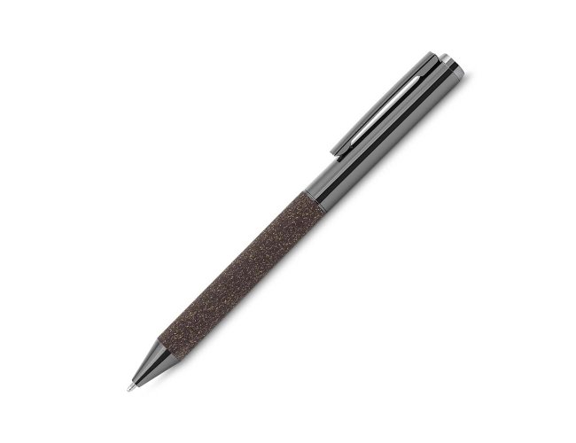 Kit de Escritório composto por caderno tamanho A5, com capa em PU e detalhe em fibra de chá ou café, contendo 80 folhas pautadas de 70g/m². Acompanha caneta metálica com acabamento no mesmo material de fibra, formando um conjunto elegante e sofisticado. O kit acompanha estojo de papelão na cor preta.