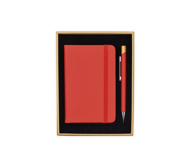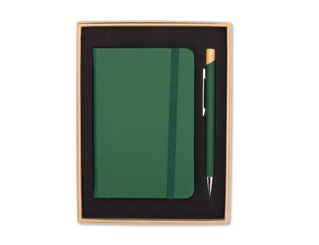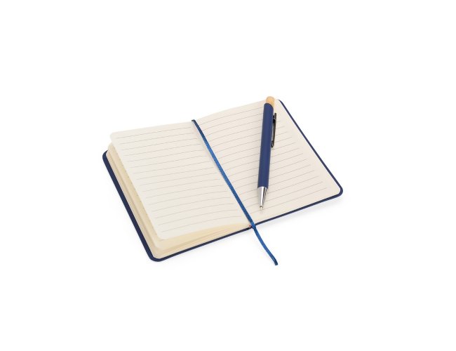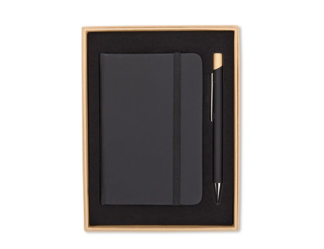 Kit executivo composto por uma caderneta e uma caneta. A caderneta possui capa dura, marca-páginas em fita de cetim e elástico para fechamento, além de aproximadamente 80 folhas com pauta. Por sua vez, a caneta metálica conta com detalhe em bambu, acionamento por clique e carga esferográfica azul de 1,0mm. Acompanha uma caixa de papelão com berço interno em espuma.