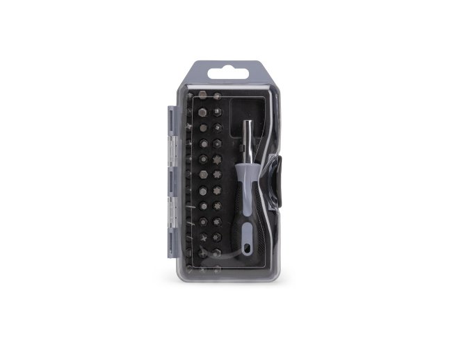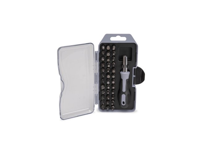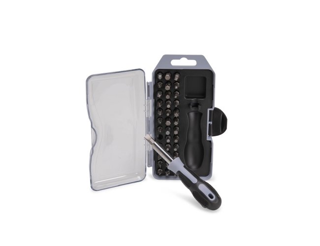 Kit de ferramentas com 37 peças. O conjunto traz uma chave porta-bits com ponta magnética e cabo ergonômico em plástico PP e TPE, além de 36 bits em formatos diferentes, incluindo: 5 com pontas de fenda, 10 Phillips, 9 Allen, 8 Torx e 4 de pontas quadradas. Acompanha caixa em plástico com tampa transparente e trava de fechamento.