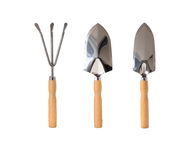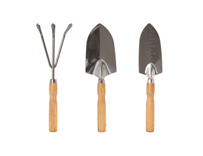 Kit de jardinagem com três peças em aço inox 410 e cabos de madeira. O conjunto é composto por um ancinho de três pontas, uma pazinha estreita e uma pazinha larga. Acompanha estojo em Oxford com fechamento em velcro.