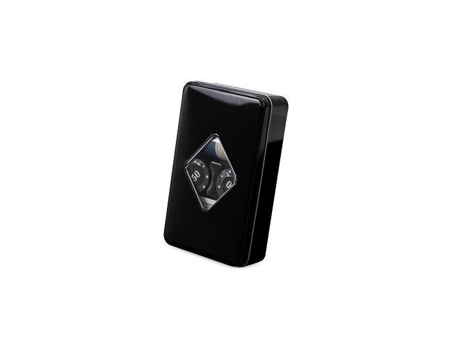 Kit poker formado por baralho completo com 54 cartas, uma ficha de dealer e 80 fichas coloridas, sendo 20 na cor preta e outras quatro cores com 15 unidades cada. Acompanha um estojo metálico para guardar o conjunto.