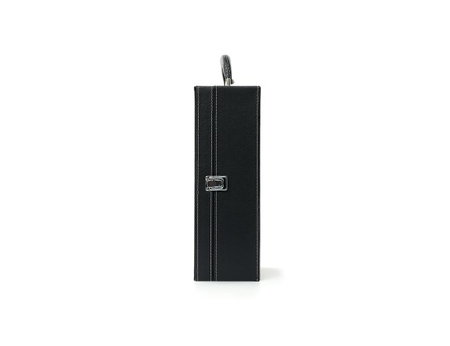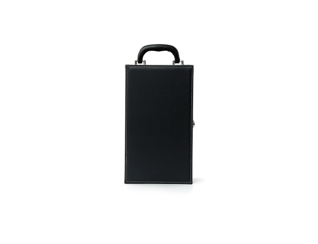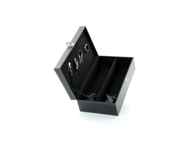 Kit vinho 4 Peças em maleta de couro sintético com duas repartições para garrafas. Contém saca-rolhas metálico, bico condutor com tampa, cortador de lacre e wine collar. Maleta com alça e trava de segurança, área interna revestida de veludo com suporte em couro sintético e velcro em cada repartição para fixação das garrafas.