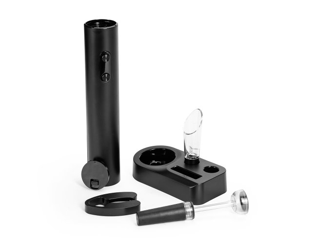 Kit vinho com cinco peças, incluindo: saca-rolhas em plástico e aço carbono com acionamento por botões alimentado por quatro pilhas AA (não inclusas), bico dosador e rolha em plástico e borracha TPR, cortador de lacre e base em plástico.