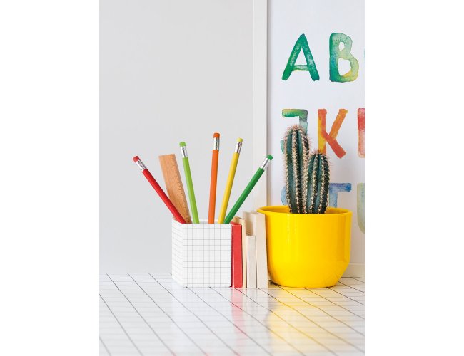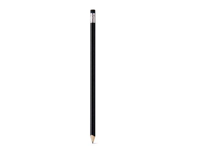 Lápis apontado com borracha. Grau de dureza: HB. Produto certificado de acordo com a portaria Inmetro nº423 de 8/out/2021 e entregue já apontado.