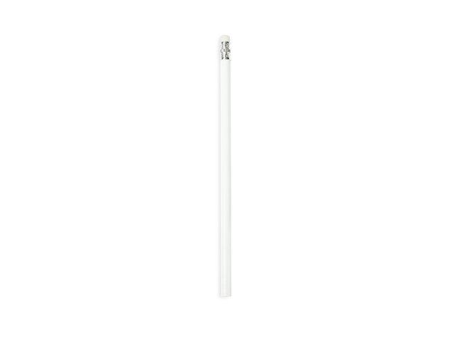 Lápis sem ponta feito em madeira com grafite preto, guarnição em metal e borracha na extremidade oposta.