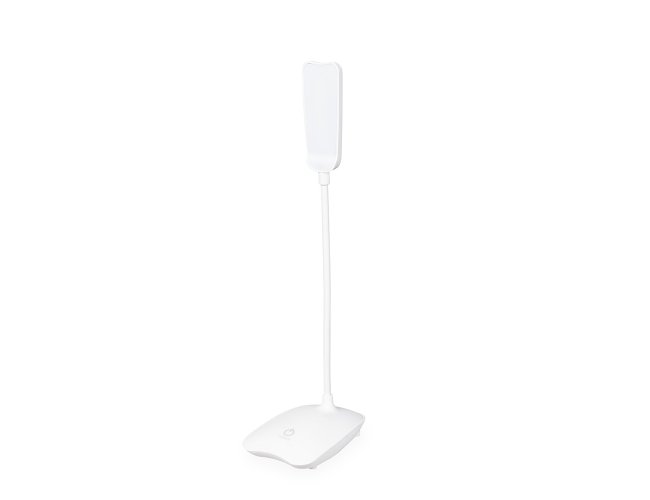 Luminária recarregável com 16 LEDs, estrutura em plástico e haste articulável em múltiplos ângulos. Possui acionamento por toque na base para a seleção de três níveis diferentes de iluminação e entrada Micro USB. Acompanha cabo micro USB para carregamento.