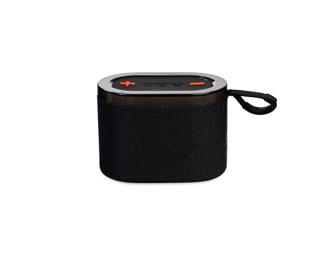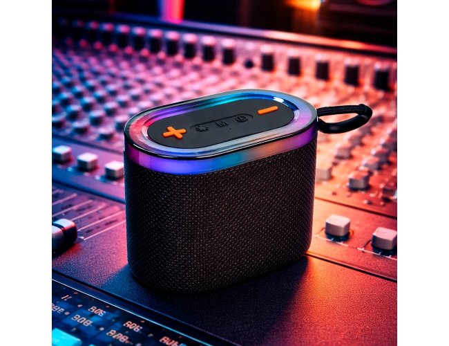 Caixa de som multimídia com estrutura em plástico ABS, revestimento em poliéster, painel de botões em silicone, iluminação RGB ajustável, base com pés antiderrapantes e alça em nylon com protetor em silicone. Possui conexões Bluetooth 5.3, rádio FM e TWS para sincronizar duas caixas de som ao mesmo tempo. Conta com entradas USB-C para recarga do aparelho e auxiliar (P2) para dispositivos compatíveis, além de portas USB-A e TF para reprodução de arquivos MP3 via pen drives e cartões microSD. Acompanha cabo USB.