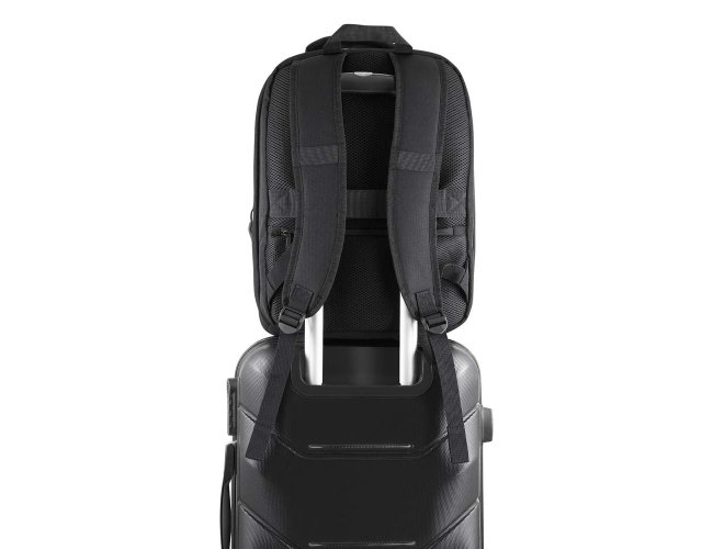 Mochila premium em poliéster 600D com detalhe em PU e interior em poliéster 210D. Conta com compartimento interno a vácuo, acompanha bomba para desinflar, expansor com zíper, compartimento frontal com zíper, compartimento para notebook de até 15,6”, compartimento com zíper nas costas, engate para mala de viagem e alças de mão e ombro acolchoadas.