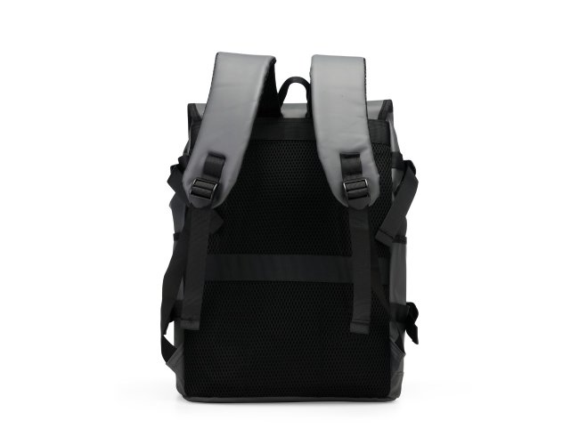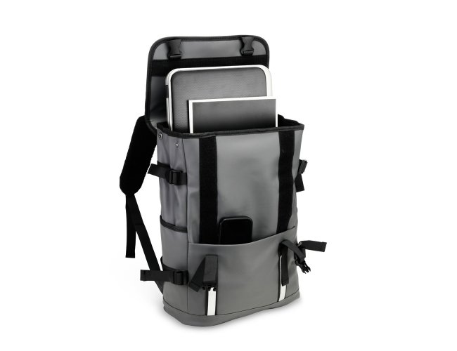 Mochila confeccionada em couro sintético com capacidade máxima de 18 litros. Possui abertura com zíper, tiras frontais em velcro e engate rápido. Apresenta divisória interna para notebook de até 15,3 polegadas, além de dois bolsos laterais e dois frontais, sendo um com fechamento em zíper próximo à abertura. Conta ainda com alças ajustáveis, costas acolchoadas em espuma respirável e engate traseiro para malas.