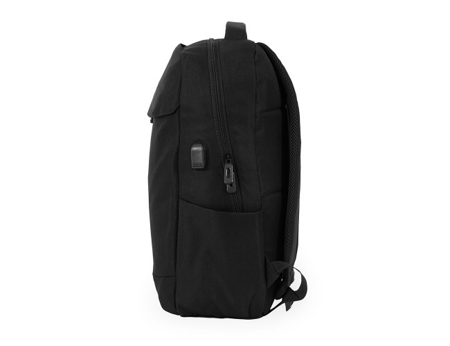 Mochila confeccionada em poliéster 200D impermeável com capacidade para até 20 litros e fechamento em zíper com puxadores plásticos. Dispõe de compartimento principal com divisória interna para notebooks de até 15,6 polegadas. Possui dois compartimentos frontais, sendo um menor, com fechamento em zíper, e outro maior, com bolsos internos e fechamento duplo em zíper vertical e velcro na parte superior. Conta ainda com dois bolsos laterais, adaptador USB externo e revestimento em espuma respirável nas alças de ombro e na alça superior de mão.