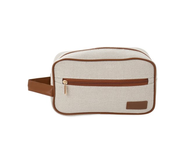 Nécessaire confeccionada em lona e fechamento em zíper. Possui bolso frontal e compartimento principal com três bolsos internos, além de alça lateral e plaquinha costurada em couro sintético.