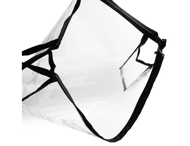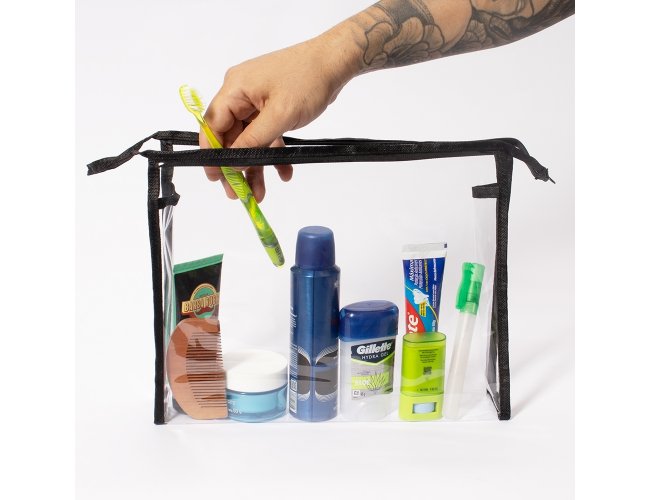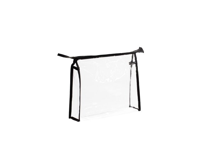 Nécessaire em PVC transparente com fechamento em zíper e detalhes em nylon, incluindo uma pequena alça lateral.