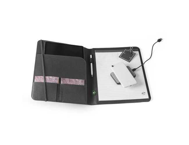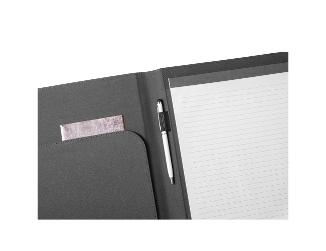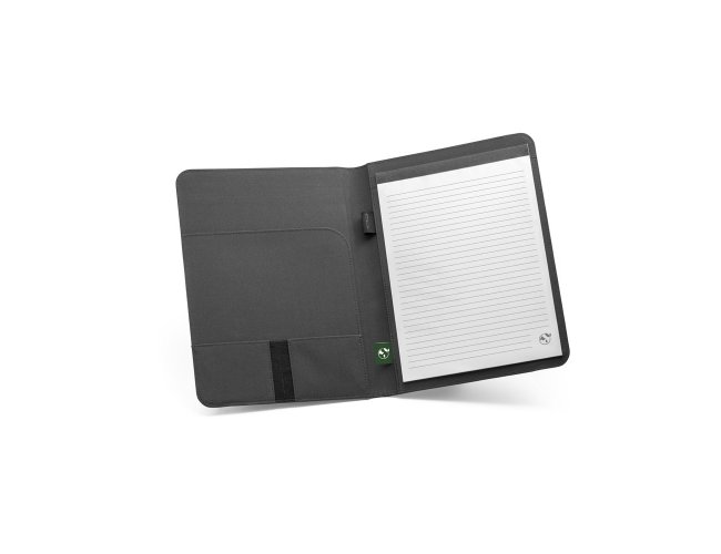 Pasta A4 em poliéster 100% reciclado 300D, com elástico para fecho. O interior contém vários bolsos, suporte para esferográfica (não inclusa) e um caderno com 40 páginas pautadas, em papel proveniente de gestão florestal sustentável. Fornecida em bolsa non-woven.