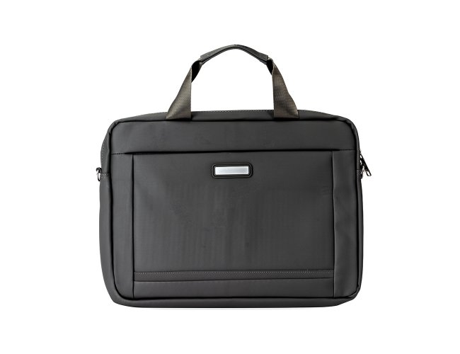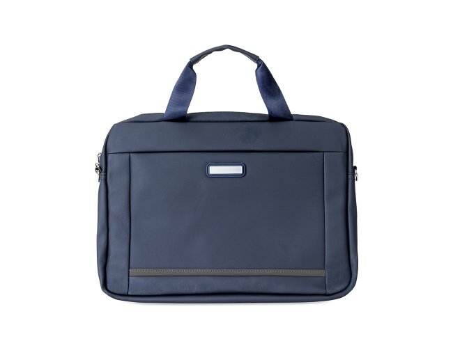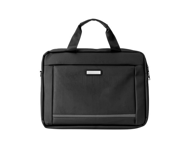 Pasta para notebook confeccionada em couro sintético impermeável com fechamento em zíper e capacidade para aparelhos de até 15,6 polegadas. Possui dois compartimentos: o principal, com revestimento acolchoado, quatro bolsos abertos de tamanhos diferentes e duas divisórias para canetas; e o frontal, com plaquinha metálica fixa na parte externa. Conta ainda com duas alças de mão e um par de abas metálicas para alças removíveis. Acompanha alça de ombro ajustável.