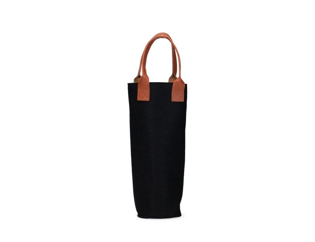Sacola porta-vinho confeccionada em feltro e alças de mão em couro sintético.