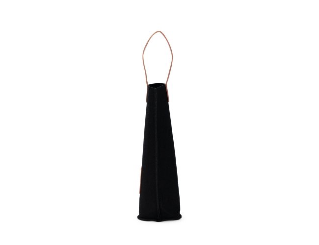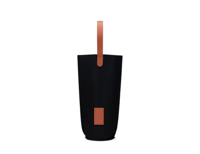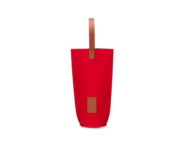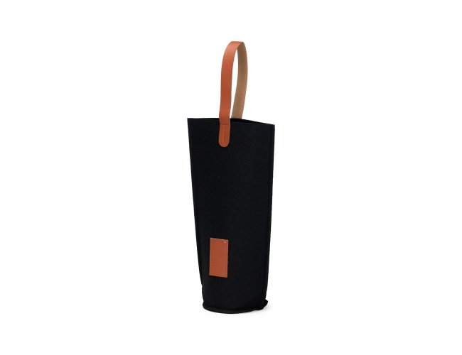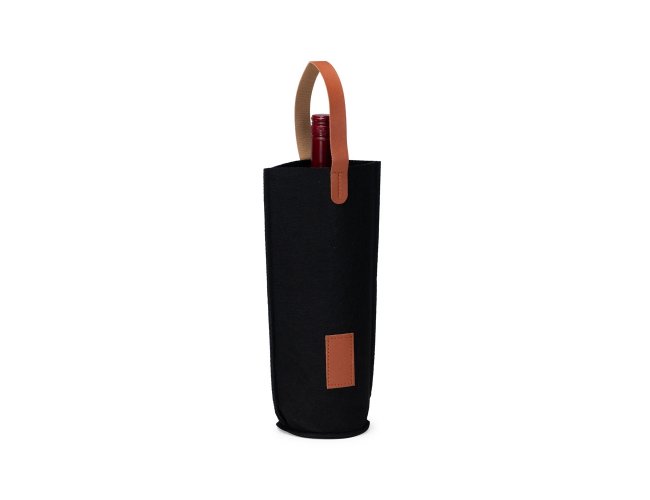 Sacola porta-vinho confeccionada em feltro com alças de mão e plaquinha retangular frontal em couro sintético.