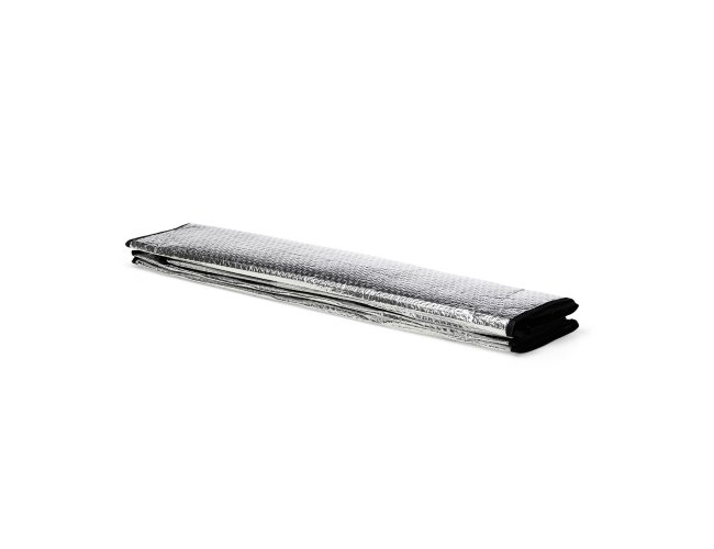 Protetor de para-brisa dobrável feito em alumínio reflexivo com bordas em nylon e um par de elásticos fixos que mantêm o protetor dobrado fora de uso. Acompanha duas ventosas para fixação no vidro do carro.