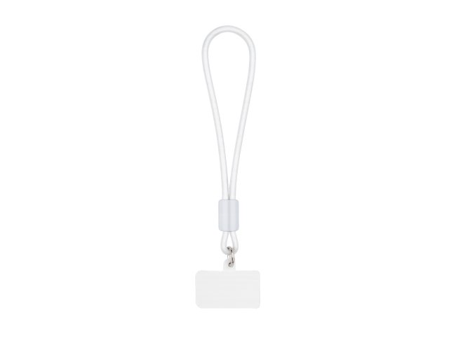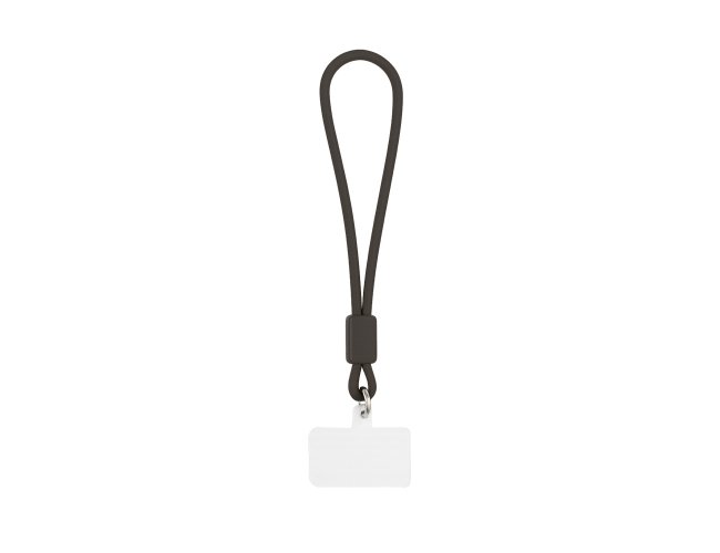 Pulseira emborrachado com mosquetão redondo conectado a um cartão retangular flexível que se encaixa na parte interna da capa de celulares, próximo à entrada para carregamento USB.