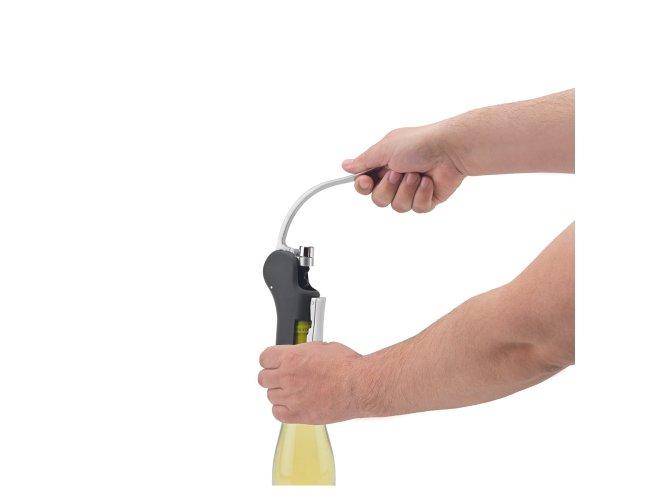 Saca-rolhas em ABS e zinco, com acabamentos em borracha. Devido à sua alavanca automática permite-lhe remover com facilidade e em poucos movimentos qualquer rolha de garrafa. Um aliado para quem gosta de vinhos. Fornecido em caixa presente.
