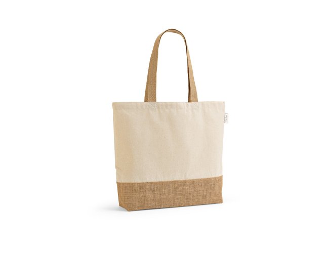 Sacola em 70% algodão reciclado e 30% poliéster reciclado (220 g/m²) com base em juta. Alças em webbing com 65 cm.
