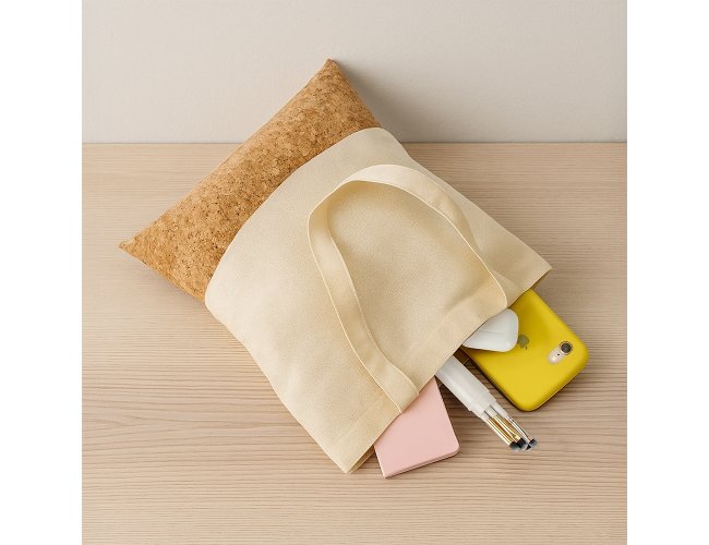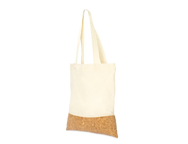 Sacola confeccionada em algodão com alças costuradas na parte interna e fundo em cortiça sintética.