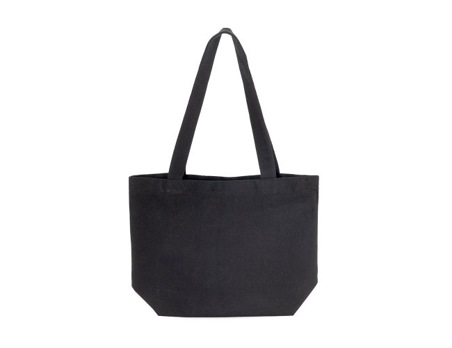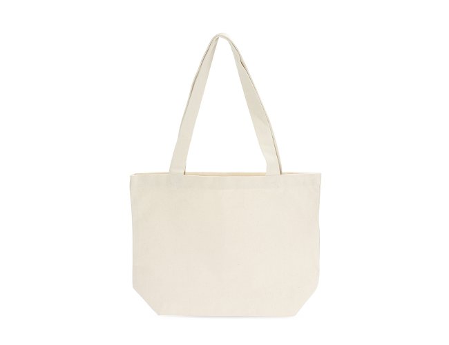 Sacola retangular em lona resistente a respingos de água. Possui duas alças fixadas por costura interna.