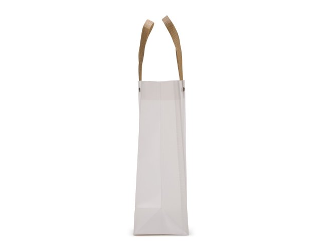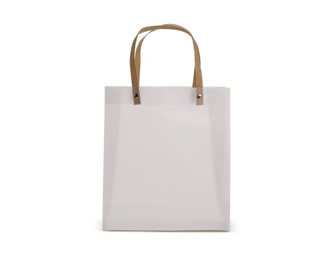 Sacola plástica com acabamento fosco e alças em papelão fixadas por botões metálicos.