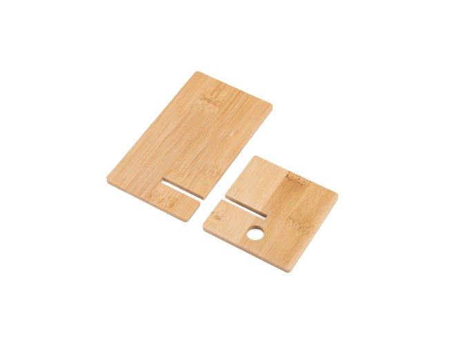 Suporte para celular em bambu, desmontável em duas partes. Contém um orifício que lhe permite carregar o seu celular enquanto utiliza o suporte. Fornecido em caixa presente de papel kraft reciclado. A cor e o resultado da impressão nos materiais naturais pode variar entre produtos.